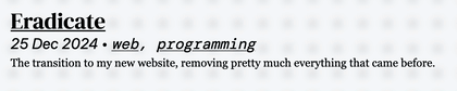 I’m super happy with how my new site turned out. I don’t know how long I can keep the site rot at bay, but I have a good feeling about my new site’s longevity. I want to expand it to have more pages with little widgets on them (such as the hidden one I use for OpenGraph image generation, see if you can find it!) as well as potentially a microblogging system for short notes; my friend Lachlan has a very comprehensive blogging setup I would love to steal a few things from. In any case, I’m very satisfied with where I am now and I’m excited to work on other projects, ones that will probably show up on this blog in the near future!