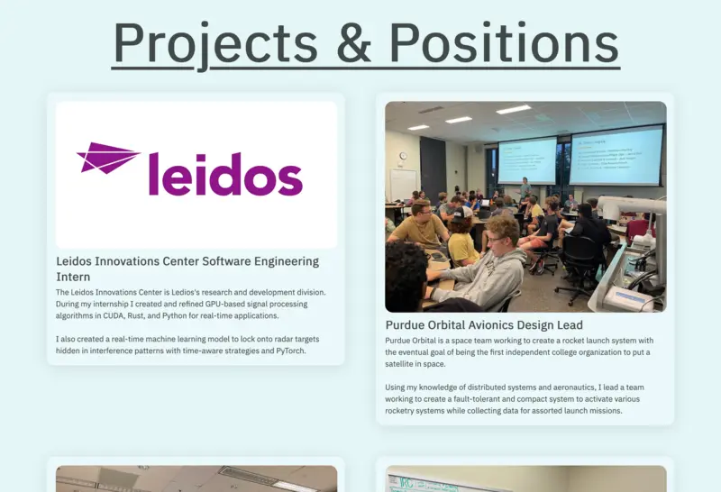 Once that was done I worked on the actual content of the site, arguably the most boring part. I had to thing of good copy that would show who I was while also beings short enough that people wouldn’t start to skip stuff. Once all of the static content was in place I started working on dynamic content. After looking at my friend Ray’s site and its corresponding source I realized my work listings could be dynamically generated from markdown files. It was my first experience using Astro’s content layer and it worked perfectly. After injecting some custom components it looked exactly how I wanted it to and will be easily maintainable into the future.